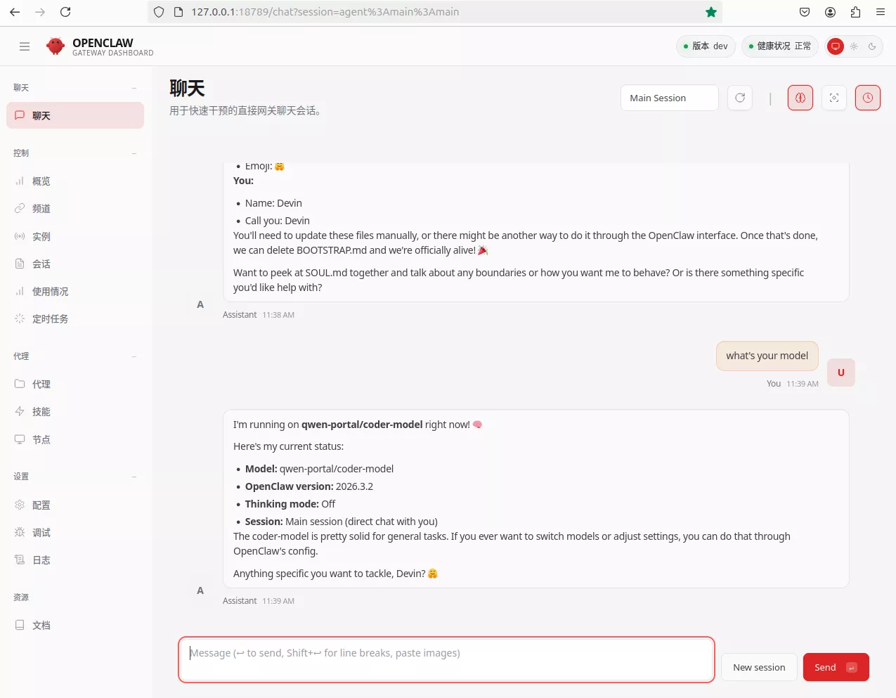 审批后,浏览器页面应自动刷新并显示webchat connected。此时,你已成功连接到 OpenClaw 控制台。